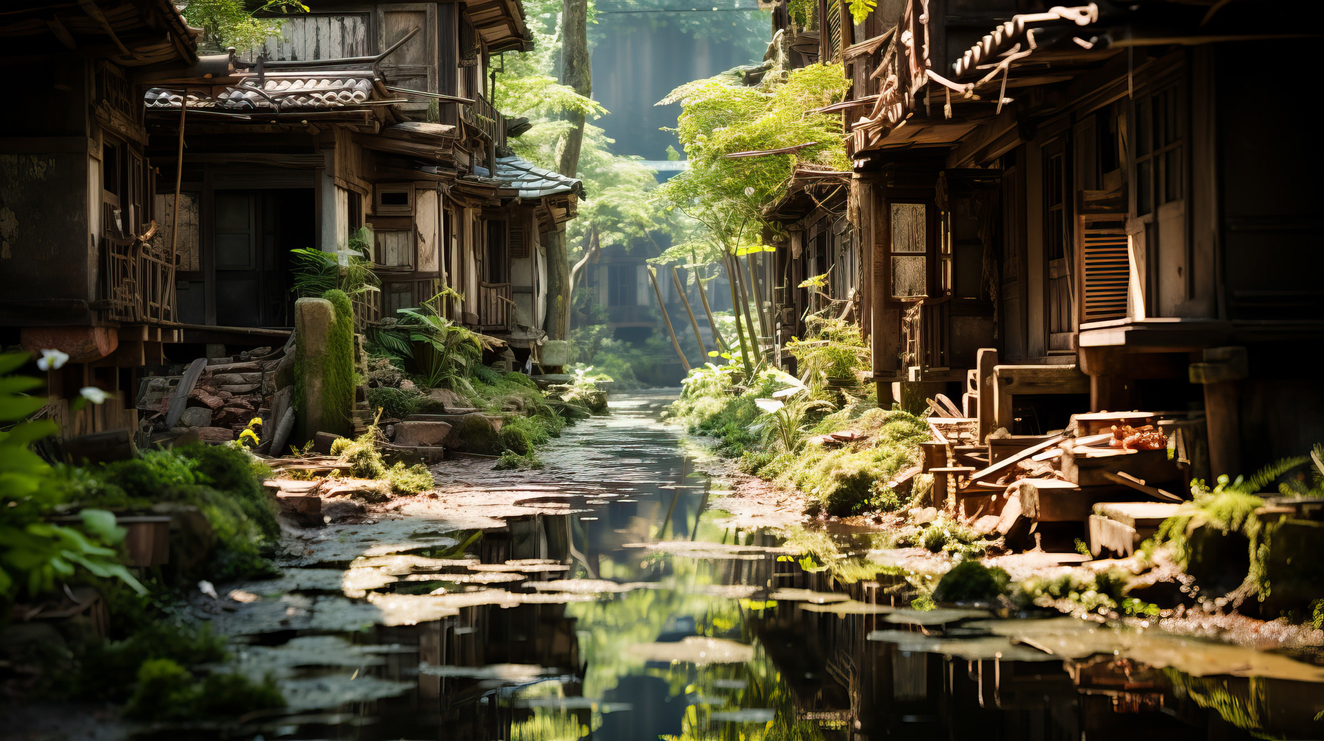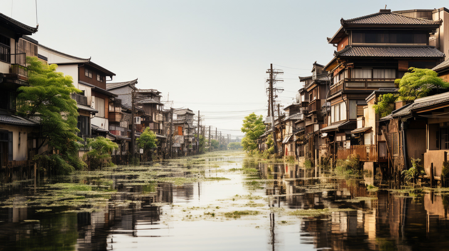 随着我深入城市,京都辉煌历史的遗迹开始在我面前展现。曾经回荡着僧侣和武士脚步声的街道如今一片寂静,鹅卵石上布满了水藻。传统的茶馆里,人们曾经一边品尝抹茶一边低声交谈,如今却空空荡荡,木质的内饰被水冲刷得一尘不染。