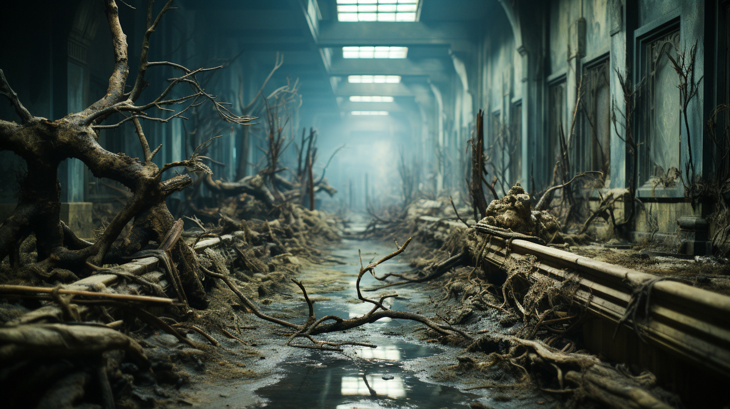 A medida que me adentraba en la ciudad, los vestigios del ilustre pasado de Kioto comenzaban a desplegarse ante mí. Calles que antaño resonaban con los pasos de monjes y samuráis yacían ahora en silencio, con sus adoquines cubiertos de algas. Las tradicionales casas de té, donde antaño se intercambiaban susurrantes conversaciones mientras se tomaba una taza de matcha, estaban vacías, con sus interiores de madera preservados por el agua.